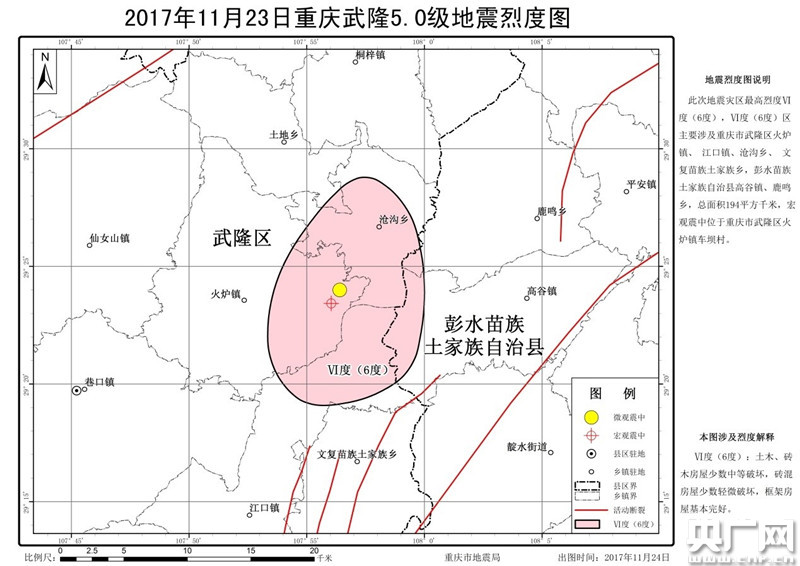 央廣網(wǎng)重慶11月25日消息(記者劉湛)11月23日,重慶武隆發(fā)生5.0級(jí)地震。記者今天從重慶市地震局了解到,由中國地震局、重慶市地震局和四川省地震局組成的現(xiàn)場工作隊(duì)依照《地震現(xiàn)場工作:調(diào)查規(guī)范》(GB/T 18208.3-2011)、《中國地震烈度表》(GB/T 17742-2008),通過災(zāi)區(qū)震害調(diào)查工作,確定了此次地震的烈度分布。