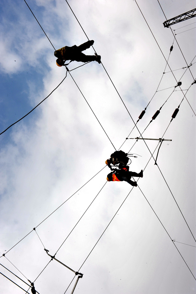中國(guó)鐵建電氣化局北方公司架接接觸網(wǎng)。張偉明攝影