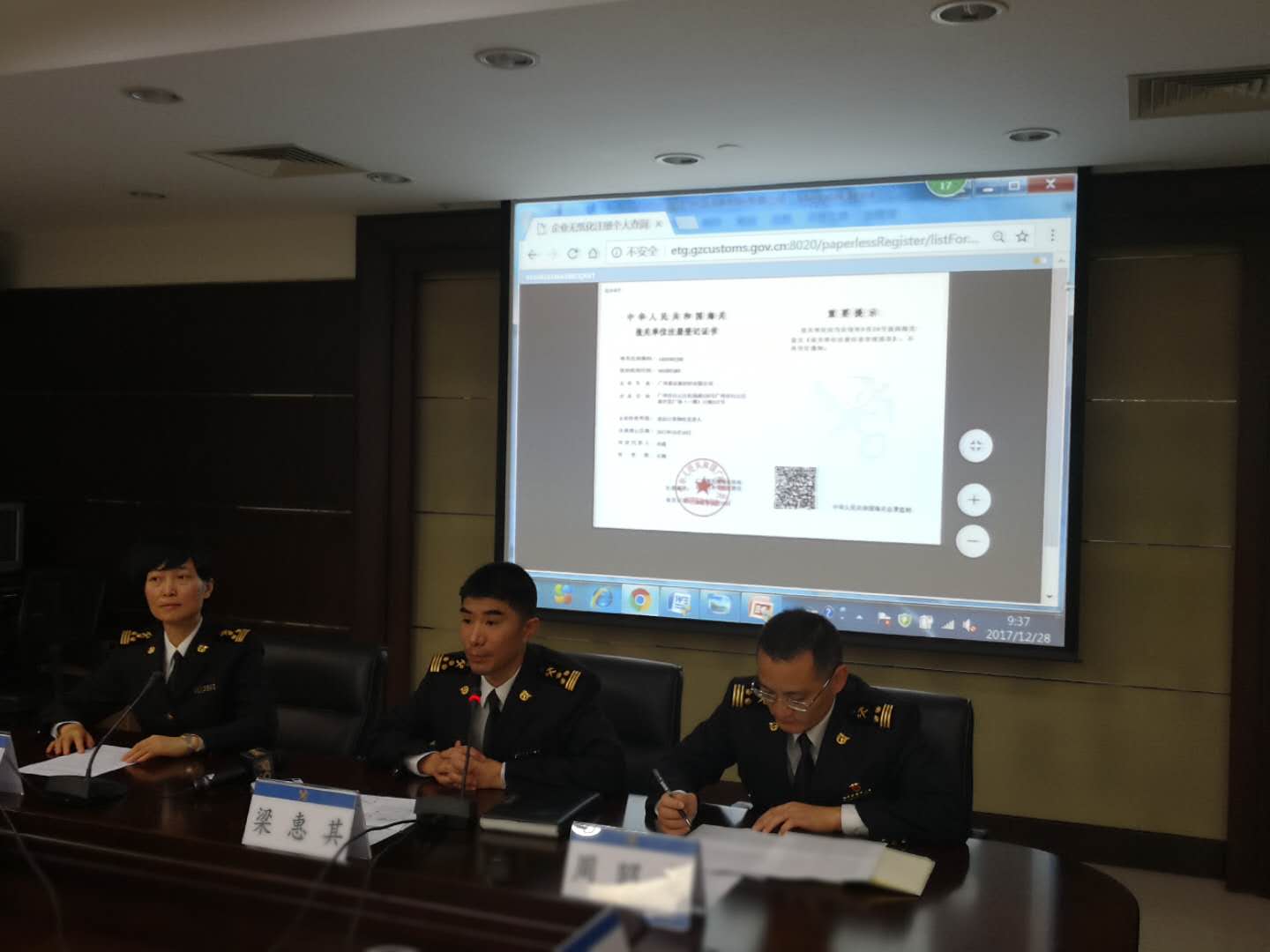 央廣網(wǎng)廣州12月28日消息(記者鄭澍 通訊員關(guān)悅)廣州海關(guān)28日召開新聞發(fā)布會通報“先行先試”推進企業(yè)注冊登記“無紙化”改革情況,廣州海關(guān)企業(yè)管理處處長梁惠其現(xiàn)場展示了全國第一張報關(guān)單位注冊登記的電子證書。從明年始,廣州海關(guān)將正式實施企業(yè)注冊登記“無紙化”,在全國率先推出全流程“無紙化”+“電子印章”服務(wù)。廣州海關(guān)通過“線上海關(guān)”系統(tǒng)對接廣州市商事主體信息平臺,實現(xiàn)企業(yè)信息數(shù)據(jù)的自動對碰,企業(yè)隨時隨地通過互聯(lián)網(wǎng)遠程向廣州海關(guān)申請辦理海關(guān)注冊登記手續(xù),系統(tǒng)審核通過后會自動加蓋電子印章,企業(yè)可以在線領(lǐng)取電子版注冊證書并打印,也可到海關(guān)辦事窗口領(lǐng)取,或由海關(guān)通過免費的郵政速遞寄達。