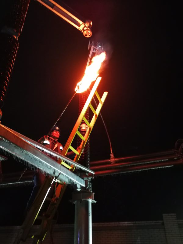 由于220千伏關通線間隔融冰刀閘發(fā)生覆冰,影響直流融冰正常進行。韶關供電局變電管理所檢修班高級技師張鐵林手持火把,登梯進行動火融冰操作,小心翼翼將刀閘觸頭上的覆冰慢慢烤化!案脖牡堕l觸頭不是導線,不通過電流,無法對其進行直流融冰,所以我們選擇了動火融冰方式!鄙仃P供電局生產(chǎn)技術部副主任易淑智介紹。