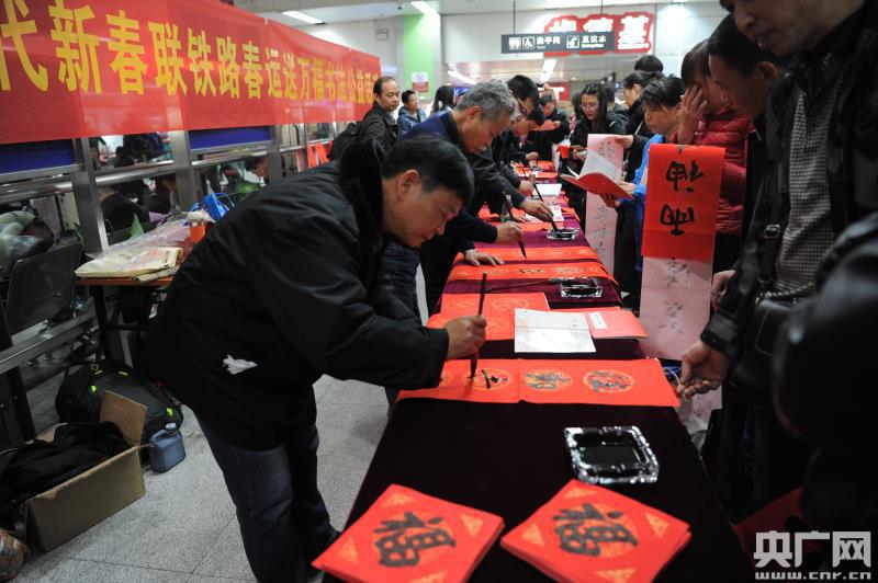 “紅桃賀歲杏迎春,丹鳳呈祥龍獻瑞”旅客分別拿著書法家寫給自己的對聯(lián)拍照留念,送春聯(lián)活動現(xiàn)場一派喜氣洋洋。來自江西的姚女士帶著一歲多的女兒拿著紅紅火火的“!弊郑吲d地對記者說:“沒想到在返鄉(xiāng)的途中,還有書法家親自送春聯(lián),我心里感到特別快樂和溫暖。”來自湖南衡陽的男孩小陳說:“我一年都沒回老家看望父母了,給父母帶一副書法家寫的對聯(lián),他們肯定喜歡。”細心的記者發(fā)現(xiàn)靦腆的小陳歡喜的明眸里竟有淚花在閃。“春滿乾坤福滿門,天增歲月人增壽”書法家很快揮毫,把新年的祝福送給小陳遠方的父母。從上午9點至16點,書法家們共為旅客和鐵路職工書寫、送出對聯(lián)500多幅,送出“!弊500多個。為2018年春運旅客安全、平安、溫馨出行增添了喜慶溫暖的氣氛。