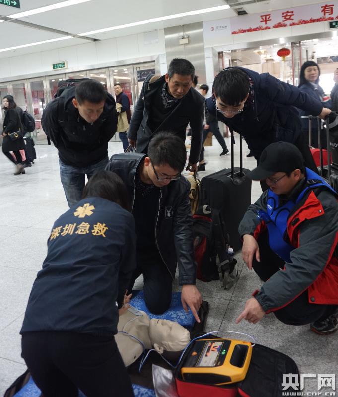 在深圳火車站長途列車候車室的活動現(xiàn)場,深圳市急救中心和深圳火車站的工作人員一同向旅客演示運用AED以及心肺復(fù)蘇進(jìn)行搶救的操作方法,并邀請旅客參與體驗。深圳急救工作中心的工作人員還通過展示海報、派發(fā)宣傳資料以及講解等方式向旅客普及急救常識。