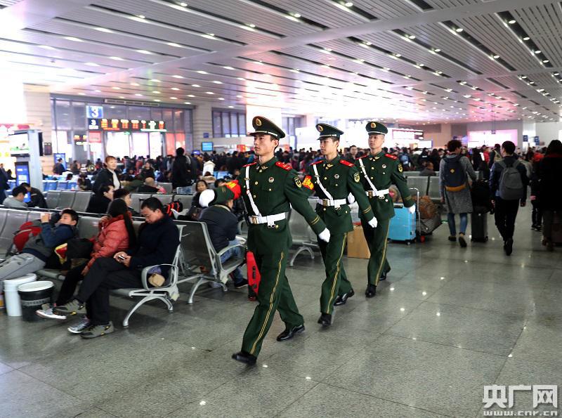 在福建泉州動(dòng)車站,負(fù)責(zé)春運(yùn)執(zhí)勤的武警官兵采取定點(diǎn)站崗檢查與流動(dòng)巡邏的方式,主要加強(qiáng)安檢通道和候車大廳的疏導(dǎo)防控,設(shè)置三道防線,防止意外情況發(fā)生,確保旅客們能夠安全返鄉(xiāng)。