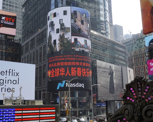 央廣網(wǎng)長沙2月18日消息(記者鄧文輝 通訊員王建軍)紐約當(dāng)?shù)貢r間2月15日,美國紐約時代廣場的納斯達(dá)克大屏幕,滾動播出中英文祝福的宣傳片:“阿凡達(dá)原型地的購物天堂恭祝全球華人新春快樂!”宣傳片上展示了中國著名風(fēng)景區(qū)張家界的獨(dú)特峰林,以及將在今年建成運(yùn)營的張家界豐澤國際公共保稅倉、東方曼哈頓全球保稅直購中心。