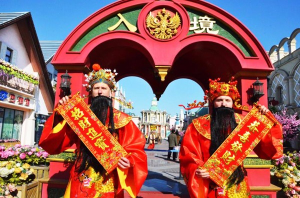 除了濃郁的軍事特色,中西合璧的混搭風(fēng)情也成為航母游的一大看點(diǎn)。公園工作人員介紹,今年公園推出的“洋”財(cái)神爺同樣聚集了不少人氣。俄羅斯姑娘和小伙在歡快的音樂伴奏下翩翩起舞,為游客們送上了獨(dú)特的新春祝福。
