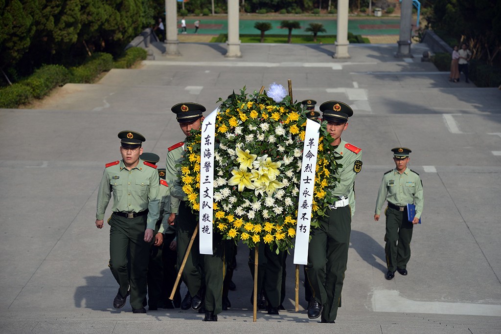 在悼念現(xiàn)場,官兵們?yōu)楦锩沂烤传I了花圈,全體官兵肅立、脫帽,向革命烈士默哀,表達對革命英烈的敬仰和哀思之情。默哀結(jié)束后,全體官兵面向黨旗莊嚴宣誓,矢志繼承革命先烈光榮傳統(tǒng),發(fā)揚愛國主義精神,踐行當代革命軍人核心價值觀,堅決維護祖國海洋權(quán)益,全力以赴完成好新形勢下國家賦予海警部隊的各項工作任務。隨后,嶺南師范學院“愛我湛江”歷史知識服務隊的學生們與官兵一同追憶了革命先烈為建立新中國拋頭顱、灑熱血的英勇事跡。