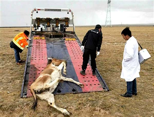 民警到達(dá)現(xiàn)場(chǎng)后,看見(jiàn)一只體型較為龐大、全身有紅棕色皮毛、似驢又像馬的動(dòng)物躺在黃草灘上,并且動(dòng)不了,但有明顯生命跡象。經(jīng)初步鑒定為國(guó)家一級(jí)保護(hù)動(dòng)物西藏野驢,由于頸部被撞傷,不能站立。民警在確定傷情后,制定救助方案,雇用板車將其運(yùn)回距離現(xiàn)場(chǎng)480公里外格爾木市野生動(dòng)物救助站進(jìn)行救治。