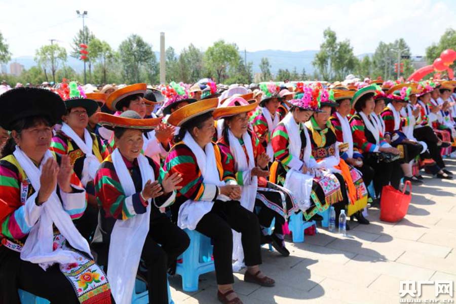身著五彩民族服飾的土族迎賓姑娘(牟泉攝)