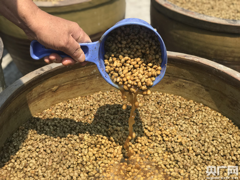 7月24日上午,在貴州紅赤水生態(tài)食品開發(fā)公司的生產(chǎn)現(xiàn)場,繁忙的生產(chǎn)景象展示了赤水竹產(chǎn)業(yè)竹筍食品的發(fā)展生機。在當?shù)馗挥刑厣臅翊讉鹘y(tǒng)工藝現(xiàn)場,57歲的董希良戴著草帽,正在醬油缸、醋缸里取豆油。他說,“這些都是原生態(tài)的材料、原生態(tài)的傳統(tǒng)工藝呀!你聞聞,曬了兩年后的這醬油,香啊!真香!”