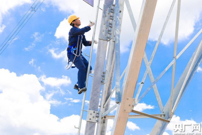 烈日高溫下,南方電網(wǎng)廣東云浮供電局員工正專注地進行接線,確保用戶正常用電。(央廣網(wǎng)發(fā) 周燊平 攝)
