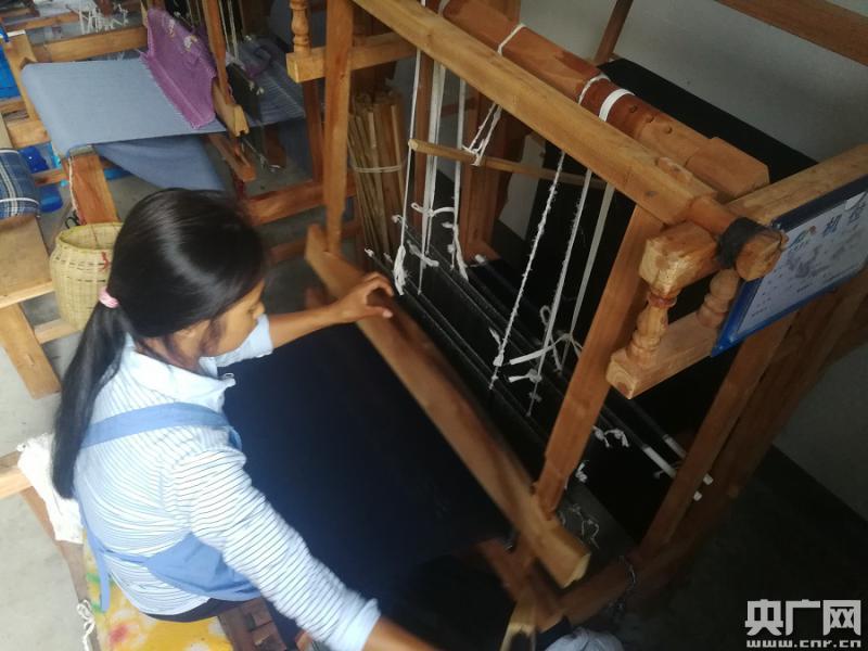“90后”媽媽梁正琴是布依族,她原來住在者相鎮(zhèn)董菁村,2017年5月全家搬遷到土布小鎮(zhèn),當(dāng)?shù)卣o他們分了房子。梁正琴的丈夫在工地上打工,她就在土布小鎮(zhèn)里織布賺錢。