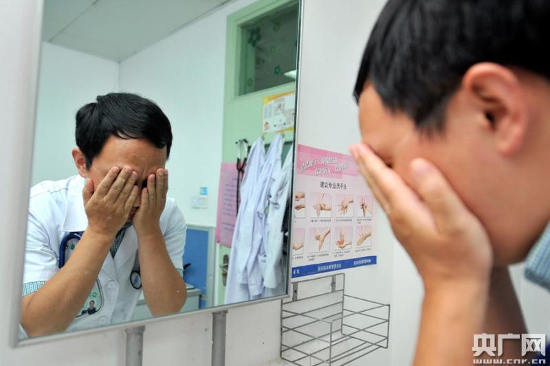 圖為疲憊不堪的羅醫(yī)生利用交辦前的空隙洗臉 (央廣網(wǎng)發(fā) 通訊員李韻熙 陶繼東)