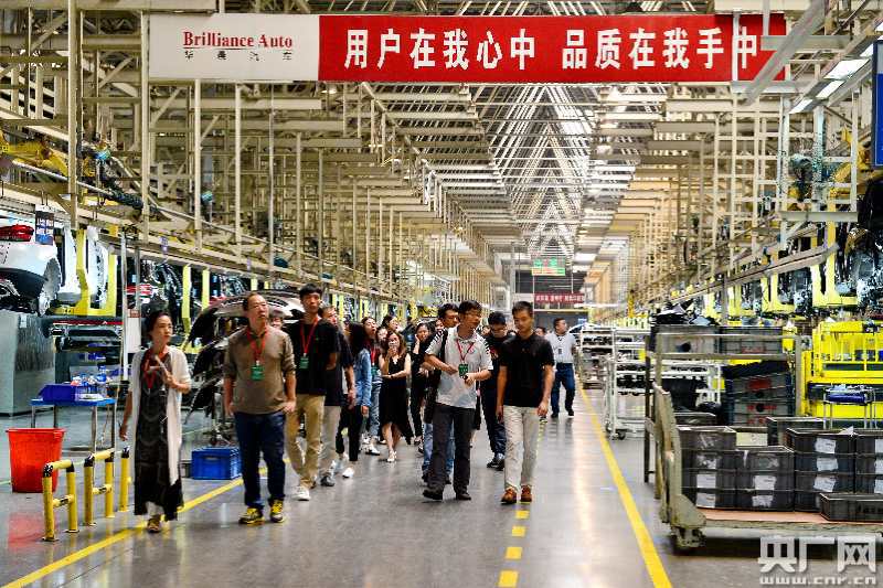 網(wǎng)媒記者們實(shí)地考察采訪華晨車整裝生產(chǎn)線(央廣網(wǎng)記者 張靜 攝)