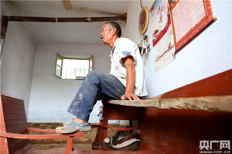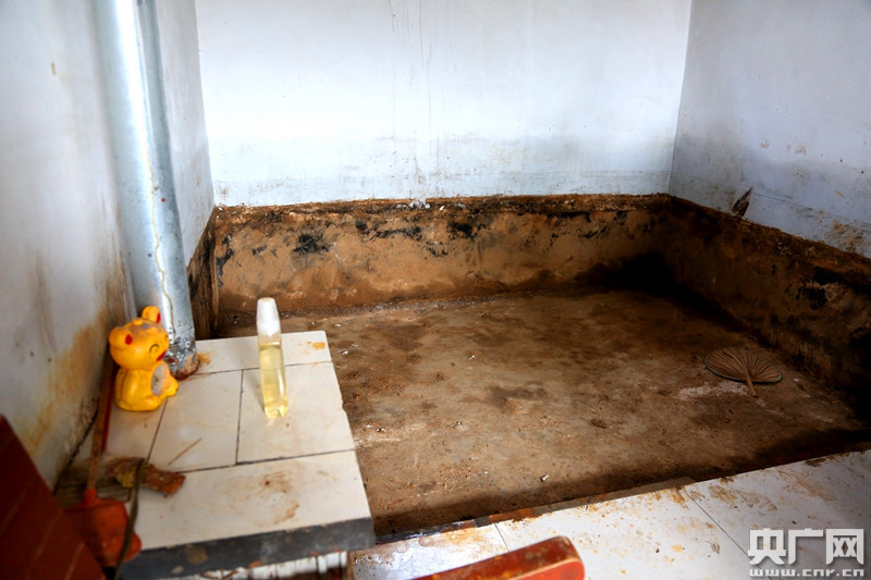 齊國臣家中的土炕因為長時間浸泡已經垮塌,老人索性將土炕拆掉等過兩天重新建造。(央廣網記者 唐磊 攝)