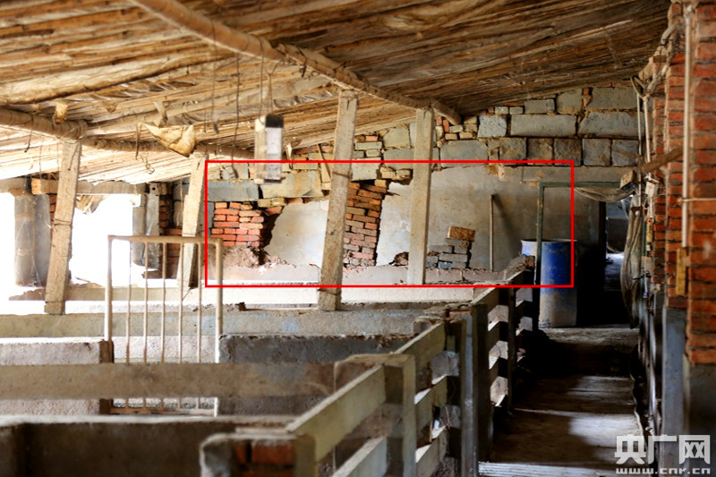 楊萬芝家中兩個豬棚中一個外墻也已經被沖垮。(央廣網記者 唐磊 攝)