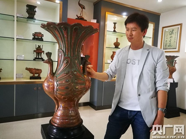國(guó)家級(jí)非物質(zhì)文化遺產(chǎn)斑銅技藝傳承人、云南省金屬工藝大師土金勇(央廣網(wǎng)記者 李健飛 攝)