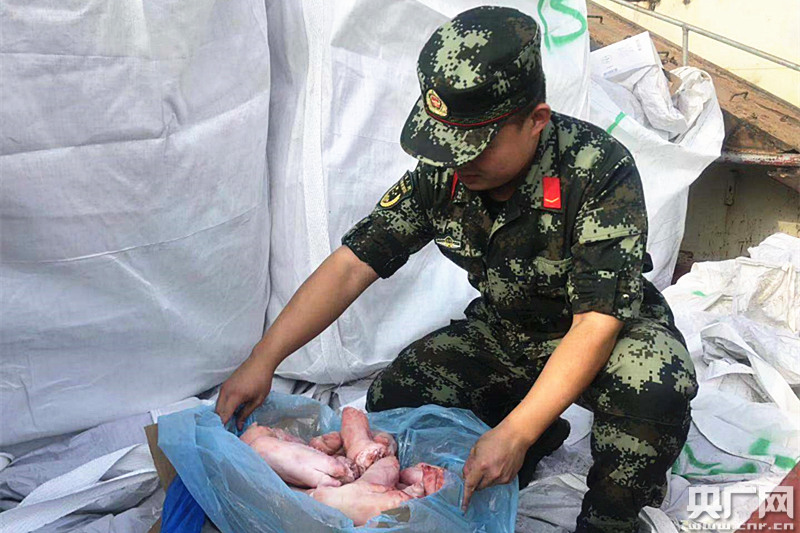 海警官兵現(xiàn)場檢查凍品。(央廣網(wǎng)發(fā) 廣東海警一支隊(duì) 供圖)