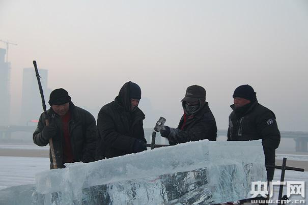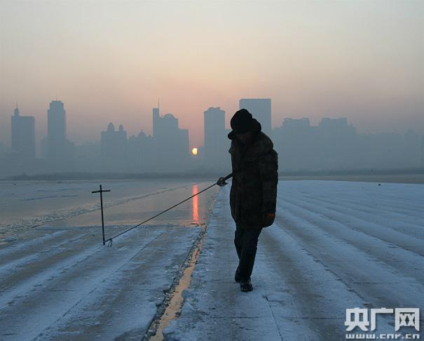 早晨6點(diǎn)37分,天剛蒙蒙亮,取冰人已經(jīng)在零下21度的江面上開始一天的工作。央廣網(wǎng)見習(xí)記者 唐國榮攝