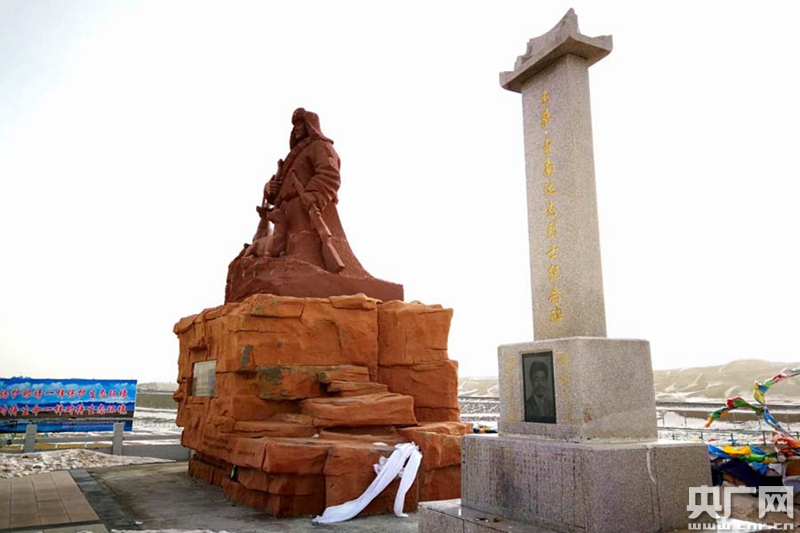 可可西里自然保護(hù)區(qū)的杰!に髂线_(dá)杰烈士紀(jì)念碑和雕像(央廣網(wǎng)記者 張雷 攝)