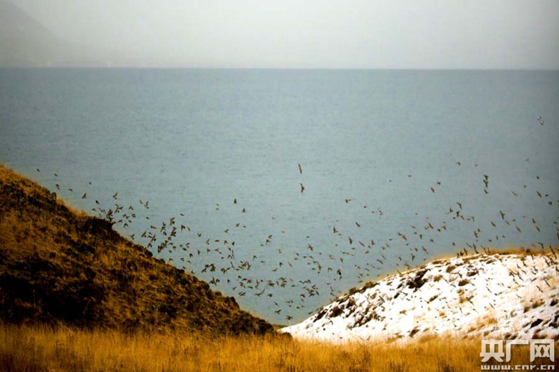 黃河源頭鄂陵湖飛翔的水鳥群(央廣網(wǎng)記者 張雷 攝)