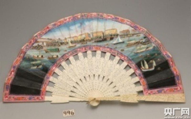 象牙骨牙片貼面人物彩繪十三行商館風(fēng)光扇。廣東省博物館供圖