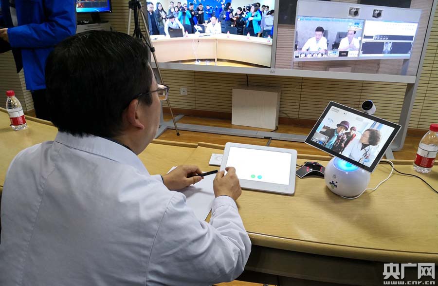 西寧市第一醫(yī)療集團總院專家正在利用遠程會診系統(tǒng)對分院患者進行診斷(央廣網(wǎng)記者葛修遠攝)