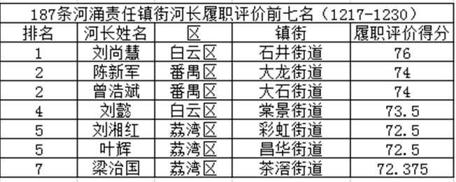 同時(shí),本期公布了187條河涌鎮(zhèn)(街)河長履職評價(jià)前七名和村(居)級河長履職評價(jià)前十名名單。另外,本期河長履職情況整體不錯(cuò)較上月都有明顯進(jìn)步,為此本期暫不曝光最后幾名。鎮(zhèn)(街)級河長履職前七名分別是:白云區(qū)石井街道劉尚慧、番禺區(qū)大龍街道陳新軍、番禺區(qū)大石街道曾浩斌、白云區(qū)棠景街道劉懿、荔灣區(qū)彩虹街道劉湘紅、荔灣區(qū)昌華街道葉輝、荔灣區(qū)茶滘街道梁治國。村(居)級河長履職前十名分別是(個(gè)別分?jǐn)?shù)一樣):番禺區(qū)小谷圍街道屈哨兵、荔灣區(qū)嶺南街道和平社區(qū)居民委員會(huì)蕭潔雯、花都區(qū)新雅街道雅瑤舊村村委會(huì)鄧榮添、番禺區(qū)南村鎮(zhèn)塘西村民委員會(huì)邵豪英、花都區(qū)新雅街道廣塘村委會(huì)劉杞良、花都區(qū)新雅街道石塘村委會(huì)黃河燎、荔灣區(qū)昌華街道西關(guān)大屋社區(qū)居民委員會(huì)何敏婷、越秀區(qū)東山街道樂景社區(qū)居民委員會(huì)劉春苗、荔灣區(qū)嶺南街道清平社區(qū)居民委員會(huì)劉雯雯、荔灣區(qū)西村街道增埗社區(qū)居民委員會(huì)胡勇山、番禺區(qū)大龍街道茶東村民委員會(huì)曹英權(quán)、荔灣區(qū)南源街道環(huán)翠園社區(qū)居民委員會(huì)梁曉華、番禺區(qū)鐘村街道鐘村四村民委員會(huì)盧杰洪、花都區(qū)新華街道新街村委會(huì)曾超波。