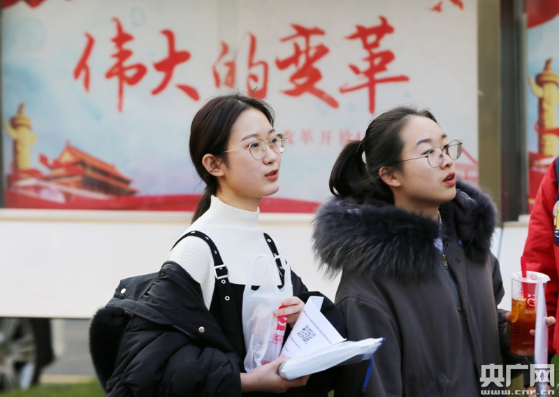 1月24日,兩位考生準(zhǔn)備進(jìn)入考場進(jìn)行最后一場考試。(央廣網(wǎng)記者 魏煒 攝)