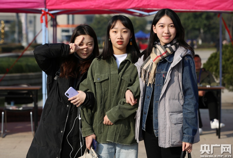 1月23日,來自山西太原的考生詹鈺珺(右)在考點和同學(xué)合影。(央廣網(wǎng)記者 魏煒 攝)