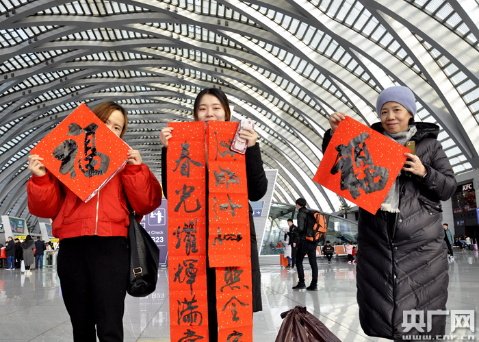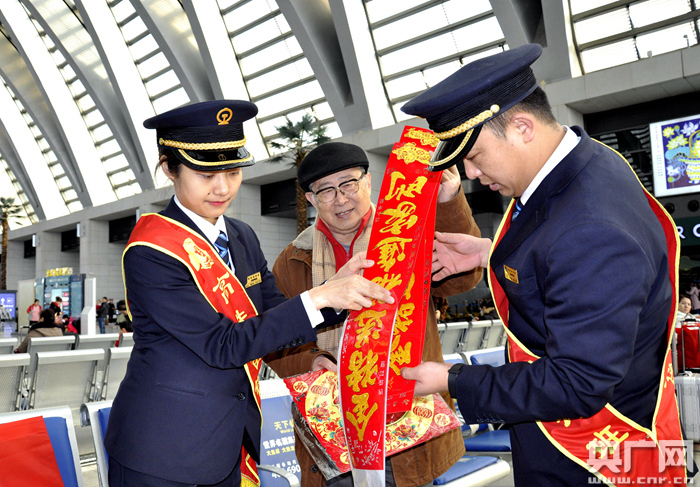 活動(dòng)現(xiàn)場(chǎng),候車旅客拿著一幅幅新春對(duì)聯(lián)和大福字喜笑顏開,紛紛通過微信、電話等方式向家人和朋友提前傳遞著新年的信息,并稱贊車站服務(wù)旅客的好舉措。活動(dòng)營(yíng)造了文明祥和、溫馨和諧的節(jié)日氣氛,展示了高鐵車站優(yōu)質(zhì)服務(wù)形象,體現(xiàn)了“三個(gè)春運(yùn)”的服務(wù)理念。