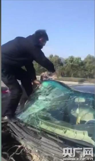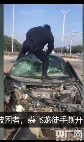 裘飛龍詢問周邊目擊者得知駕駛員仍被困車內(nèi),車門因變形無法打開,便徑直跳上引擎蓋,嘗試徒手撕開車輛前擋風(fēng)玻璃。