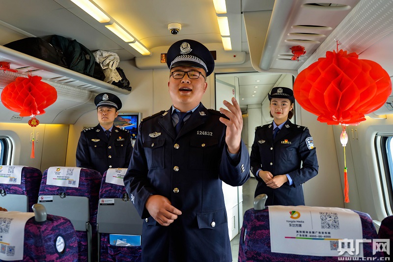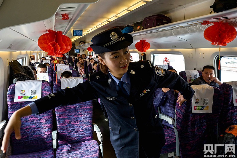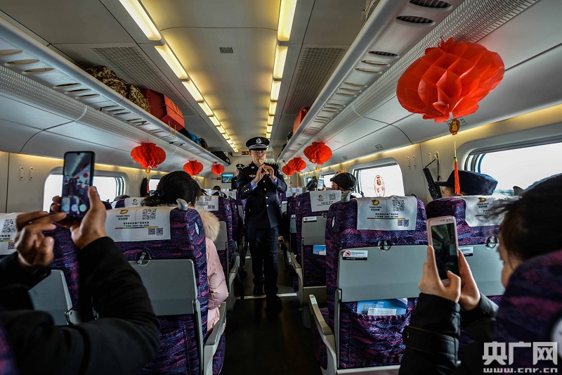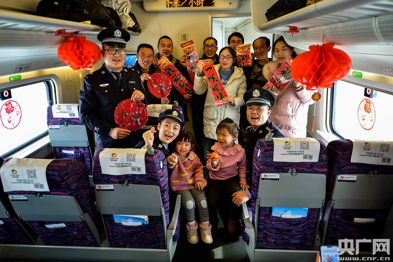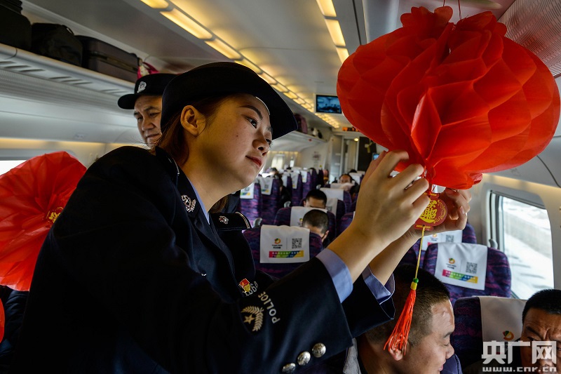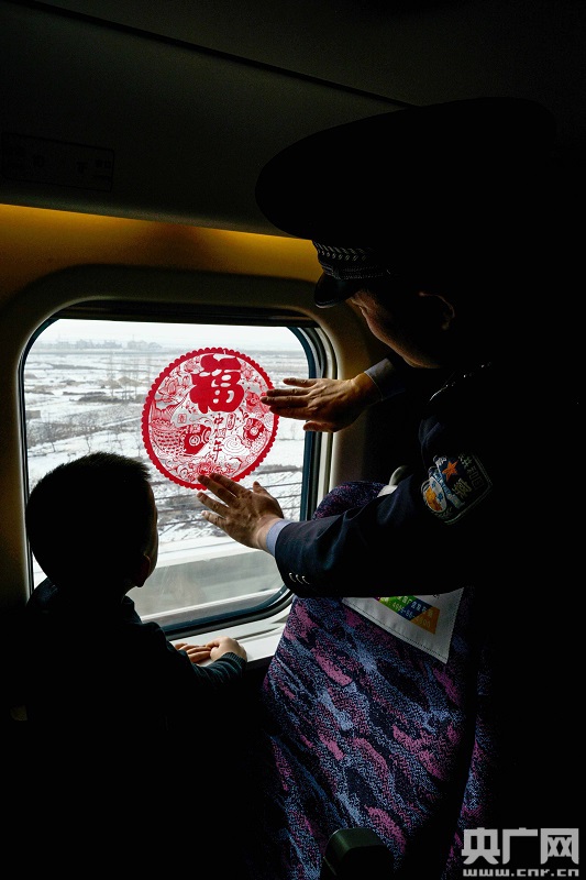 文藝小分隊民警在高鐵車廂貼福字窗花(央廣網(wǎng)發(fā) 劉東帥攝)