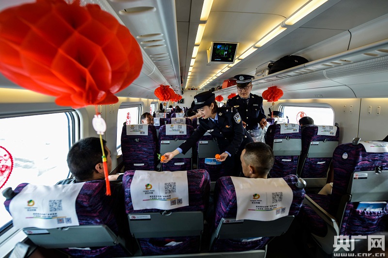 活動中,文藝小分隊的民警們還為乘客貼心準備了水果。并通過高鐵安全知識有獎問答的方式,贈送給旅客春節(jié)對聯(lián)。據(jù)悉,這已經(jīng)武威公安處連續(xù)五年,大年三十在高鐵列車上開展文藝演出送祝;顒印