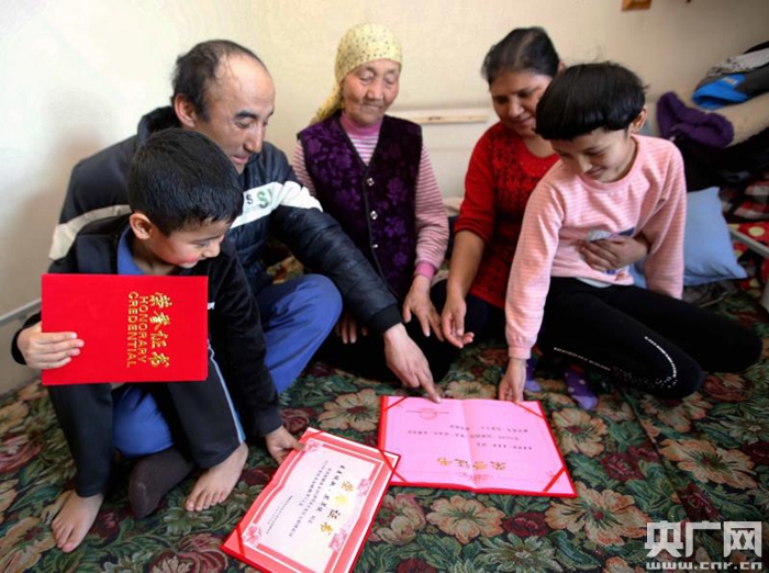 一家五口圍坐在一起,欣賞麥麥麥提在準(zhǔn)東開發(fā)區(qū)獲得的榮譽(央廣網(wǎng)發(fā) 王前喜 攝)