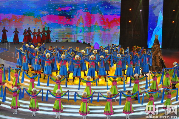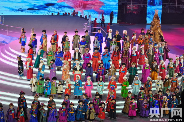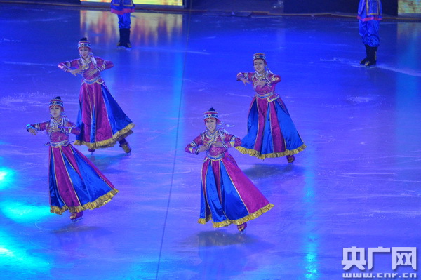 開幕式表演以“相約呼倫貝爾”為主題,分為“冰雪燃情”“冰雪逐夢”“冰雪之約”三個篇章。隨著序曲《牧歌》的悠揚響起,壯美的呼倫貝爾大草原張開雙臂,歡迎全區(qū)冰雪運動健兒和四海朋友的到來!都轫灐贰稓g樂那達慕》等冰上舞蹈表演展現(xiàn)了草原民族傳統(tǒng)文化與現(xiàn)代冰雪運動激情碰撞的“冰雪奇緣”,讓冬日的草原充滿生機與活力。呼倫貝爾大草原上的天籟之音——五彩呼倫貝爾兒童合唱團的小朋友們演唱了《三少民族聯(lián)歌》,歡快的旋律描繪出各族人民其樂融融生活在一起的和諧畫面;伴隨著《讓生命遠(yuǎn)航》激情豪邁的歌聲,速滑、冰球運動員精神抖擻地滑行入場,激情豪邁的歌聲和活力四射的速滑表演將開幕式推向高潮。一曲氣勢恢宏的馬頭琴演奏《萬馬奔騰》為參賽隊加油助威,為冬運會助力添彩,寄語躍升的體育夢想。開幕式在大合唱《呼倫貝爾大草原》的歌聲中圓滿結(jié)束,純潔的冰雪,激情的盛會,承載著奏響2022年冬奧會序曲的重任。