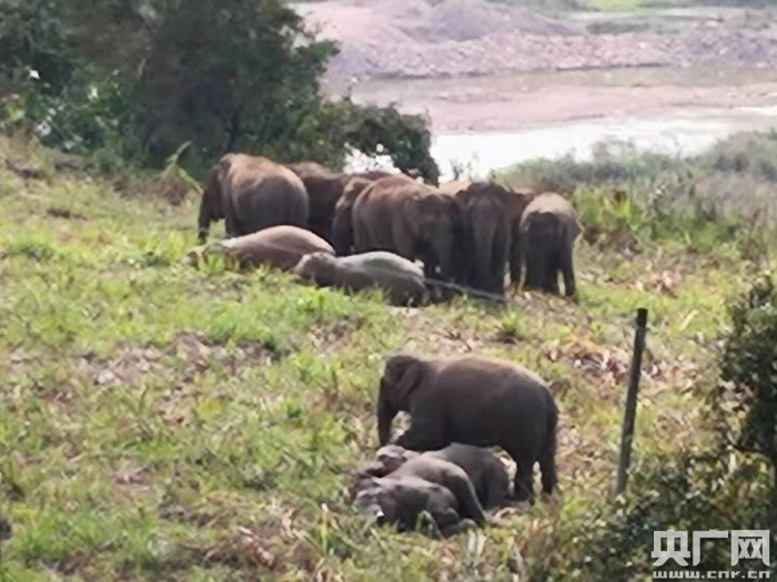 當(dāng)天11時左右,該村一名農(nóng)戶正好要開車到普洱市區(qū)買魚苗,剛好出門的時候,就在家門口的臭水河邊豬場公路沿線遇到了2頭小野象在此覓食。他緩慢把車停下,也并未打擾它們,小野象也可能沒發(fā)現(xiàn)他。而隨后的一幕令人吃驚!村民突然看見緊隨其后共有22頭亞洲野象在周邊徘徊,他就把這一畫面手機(jī)記錄下來。