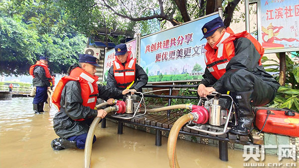 森林消防指戰(zhàn)員對內(nèi)澇區(qū)進(jìn)行排澇(央廣網(wǎng)發(fā) 通訊員曹軼群 攝)