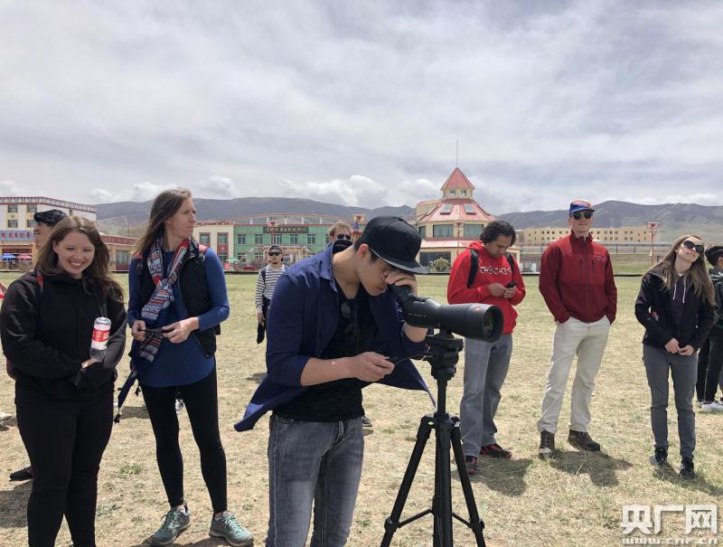 留學(xué)生通過(guò)望遠(yuǎn)鏡觀察青海湖棲息鳥(niǎo)類(央廣網(wǎng)記者 劉澤耕 攝)
