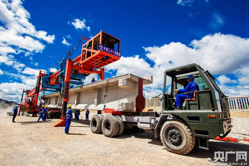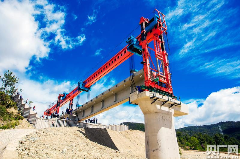麗香鐵路第一片T梁架設(shè)到位。(央廣網(wǎng)發(fā) 陳暢 攝)