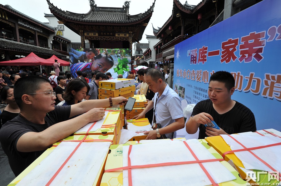 央廣網(wǎng)寧波6月21日消息(記者杜金明)6月20日上午,在寧波鼓樓舉行的甬庫一家親庫車小白杏愛心義賣助力消費扶貧現(xiàn)場,從新疆庫車運至寧波的100多箱新鮮小白杏受到市民的爭先購買。