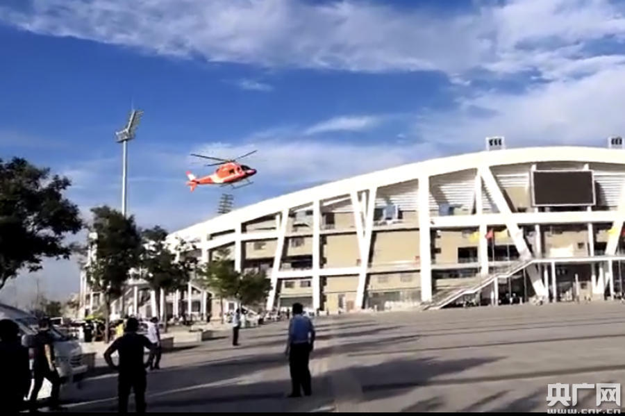 救援直升機(jī)降落定邊體育場(chǎng)(央廣網(wǎng)發(fā) 視頻截圖)