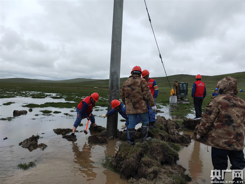 7月6日,國(guó)網(wǎng)玉樹供電公司員工正在緊急處理發(fā)生傾斜的電線桿(央廣網(wǎng)發(fā) 徐曉韜 攝)