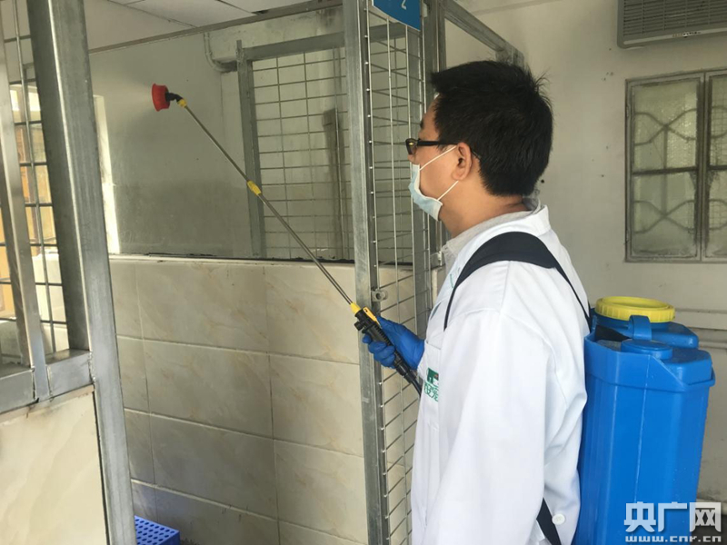 海關(guān)關(guān)員對(duì)進(jìn)境寵物隔離場(chǎng)地進(jìn)行消毒(央廣網(wǎng)發(fā) 余小密 攝)