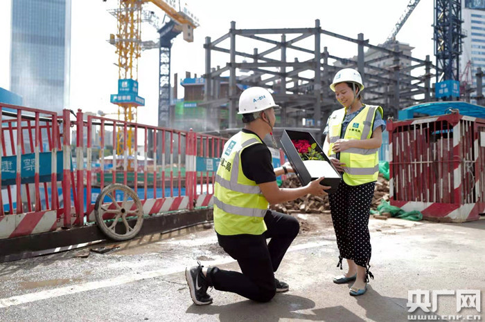 塔吊司機成忠富今年31歲,塔吊指揮何丹今年26歲,他們是一對農(nóng)民工夫妻,常年在外打工!皬臎]過過情人節(jié),這還是第一次,老婆和我在工地上吃苦卻沒給過老婆什么,感謝項目為我們搭建這難得的機會,老婆,我愛你!彼跛緳C成忠富激動的向妻子表白著,妻子何丹飽含深情地笑道,“苦不苦的無所謂,只要天天能在一起就滿足了,老公,你辛苦了!薄
