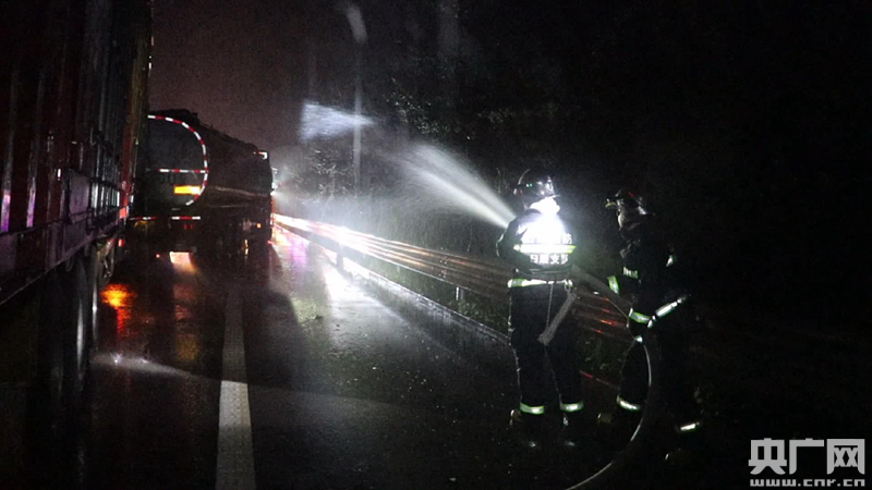 事故發(fā)生的原因是由于貨車司機(jī)疲勞駕駛,加之雨天視線不好,路面濕滑,司機(jī)剎不住車,導(dǎo)致貨車撞上停在路邊的甲醇罐車。(央廣網(wǎng)發(fā) 山東消防供圖)