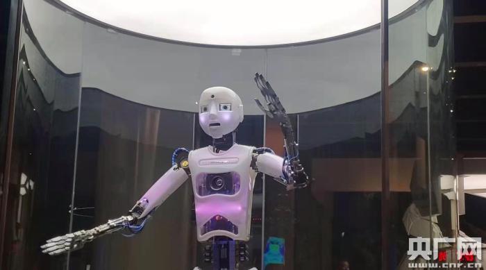 人形機(jī)器人小羅正在演唱歌曲《我和我的祖國(guó)》,眼神、手勢(shì)、身姿都惟妙惟肖。(央廣網(wǎng)記者 劉陽(yáng) 攝)