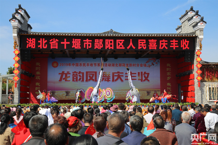 2019年9月23日,在湖北省十堰市鄖陽區(qū)柳陂鎮(zhèn)龍韻村“龍韻鳳舞慶豐收”活動現(xiàn)場,當(dāng)?shù)厝罕姳硌荨栋鰵の琛。(央廣網(wǎng)發(fā) 通訊員曹忠宏 攝)