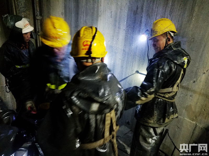 記者在現(xiàn)場(chǎng)看到,工人們每次下井施工,都要乘坐吊桶,面積不到5平方米,乘坐不能超過5人,而且上下其間沒有燈光照明。從井口到井底,需要四五分鐘的時(shí)間,豎井內(nèi)施工區(qū)面積不足30平方米,每個(gè)工人相當(dāng)于在一個(gè)普通的餐桌上作業(yè)。因涌水不斷,工人們的防水服幾乎起不到作用,近乎泡在水里,一個(gè)班要堅(jiān)持8個(gè)小時(shí)。