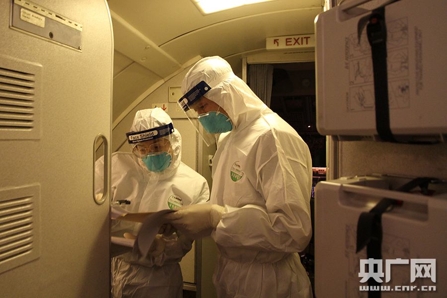 海關(guān)工作人員上機(jī)檢疫(央廣網(wǎng)發(fā) 銀川海關(guān)供圖)