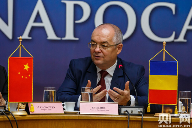 羅馬尼亞克盧日-納波卡市市長埃米爾·博克接受媒體采訪(央廣網(wǎng)發(fā) 圖片由克盧日-納波卡市外辦提供)
